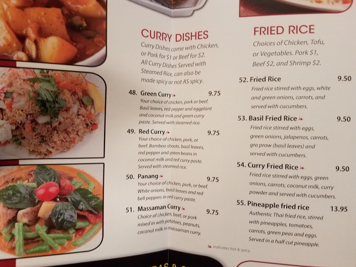 - house fried rice made with garlic red curry chili paste, mixed with peas carrots, onion, egg, jalapeno and Thai basil